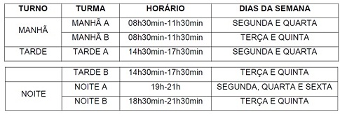 1.4. FORMA DE OFERTA: As vagas ofertadas serão distribuídas, igualitariamente, em 06 (seis) turmas para a realização das aulas expositivas e práticas do curso básico de informática do Pró-Estudante Inclusão Digital, sendo 2 (duas) turmas no turno da manhã, 2 (duas) turmas no turno da tarde e 2 (duas) turmas no turno da noite, conforme a seguinte tabela: